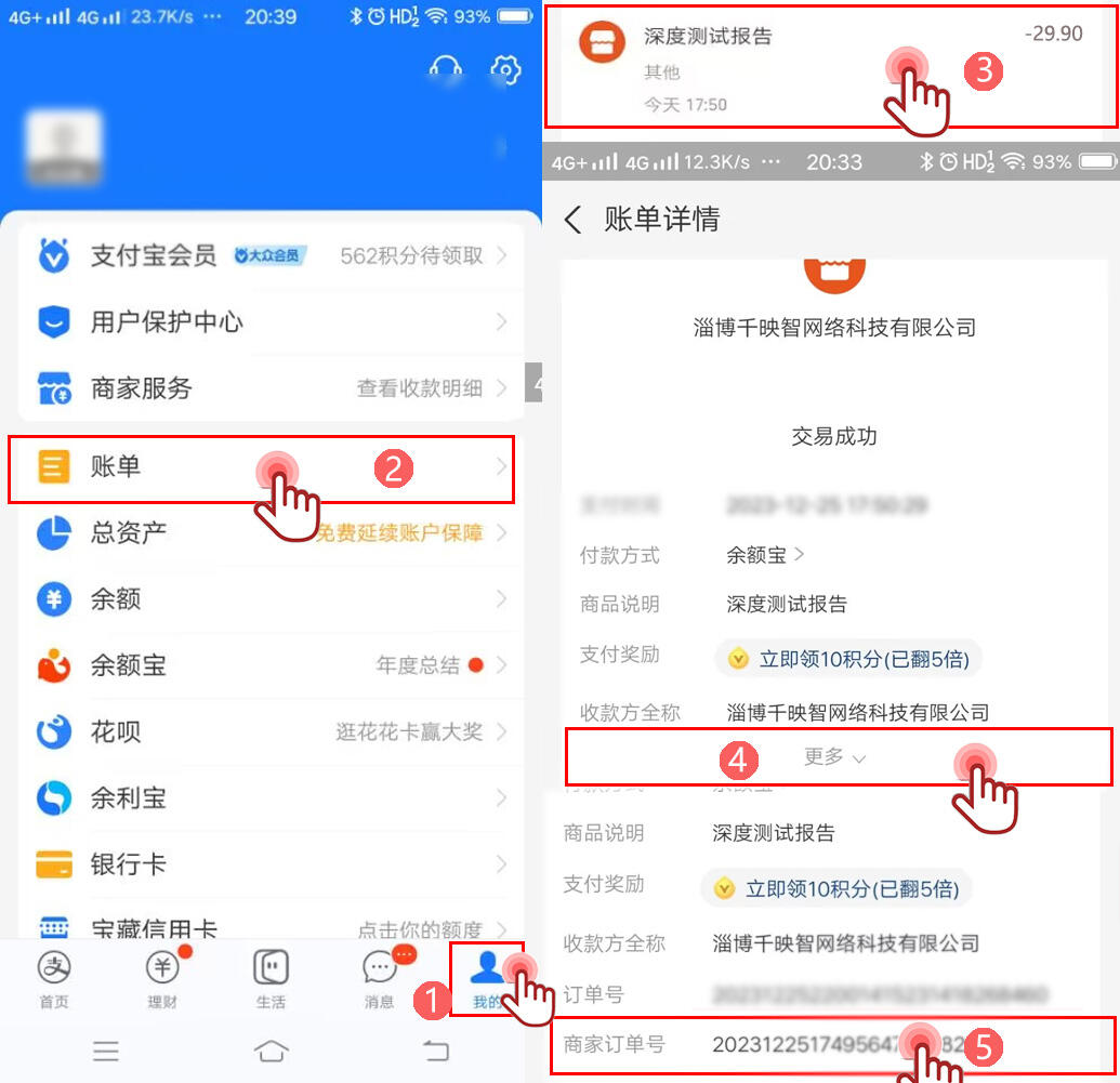支付宝支付:点击支付宝的「我的」进⼊「账单」选项,复制商家订单号到当前页面进行查询