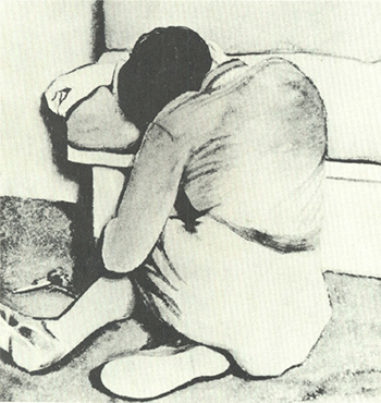 A、一个小男孩独自一人坐在门口,他正在被一些事情困扰,正合起双手在虔诚地祈祷